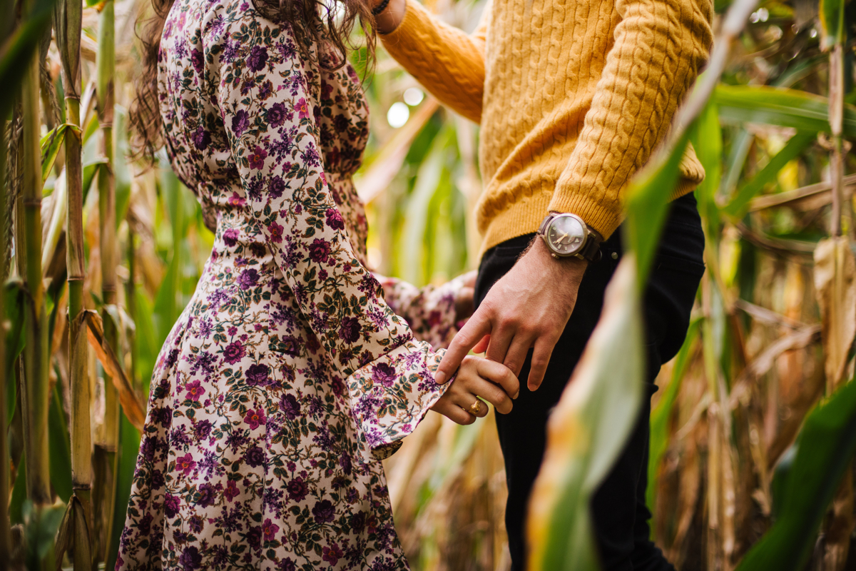 O casal estava se divertindo muito durante a sessão. A energia positiva e a alegria transparecia no rosto deles. Os campos de milho ofereciam uma infinidade de possibilidades para explorar e nos divertirmos, seja correndo entre as fileiras, namorando entre elas, se escondendo entre as plantas altas ou simplesmente aproveitando o ambiente tranquilo.