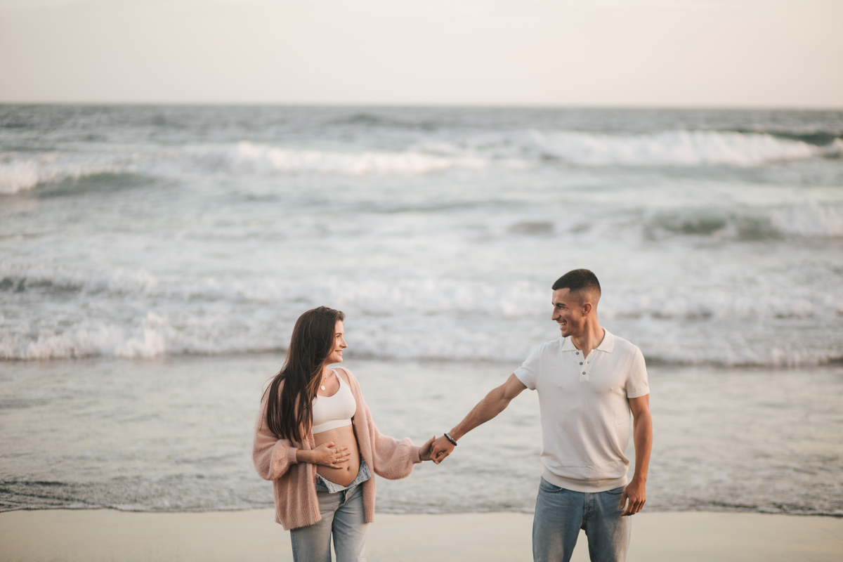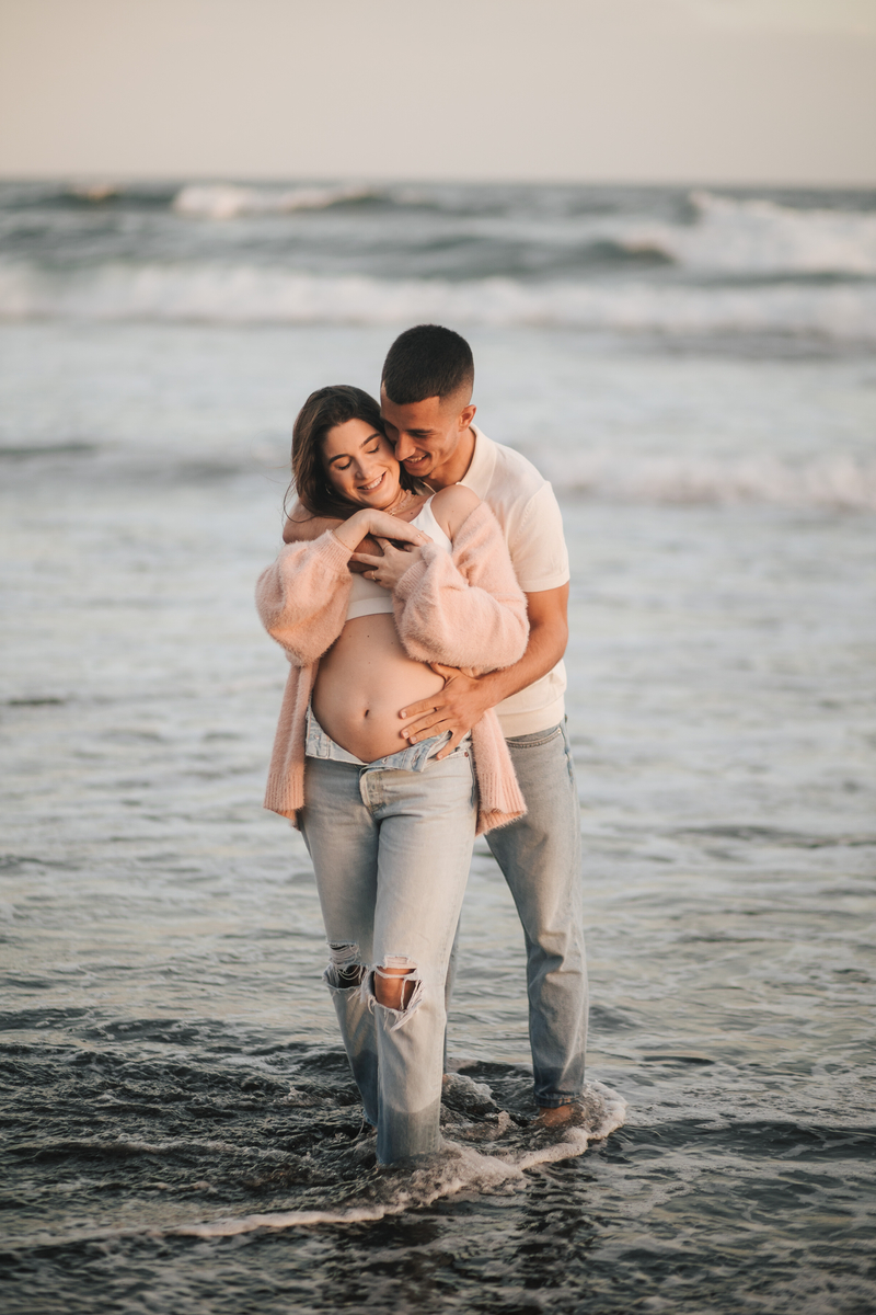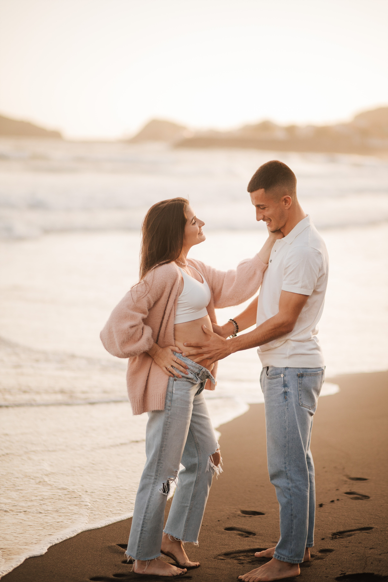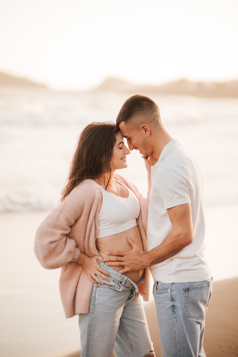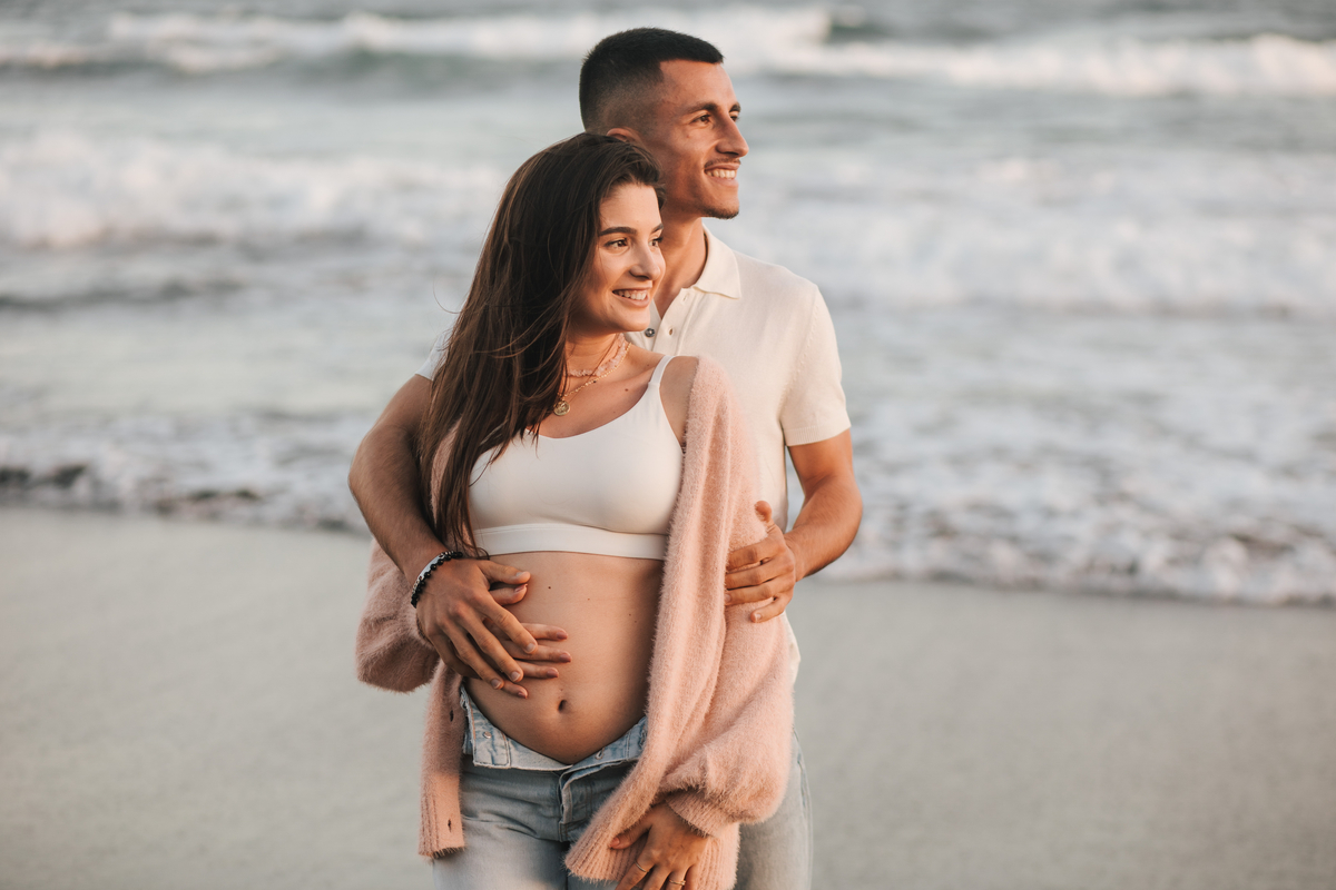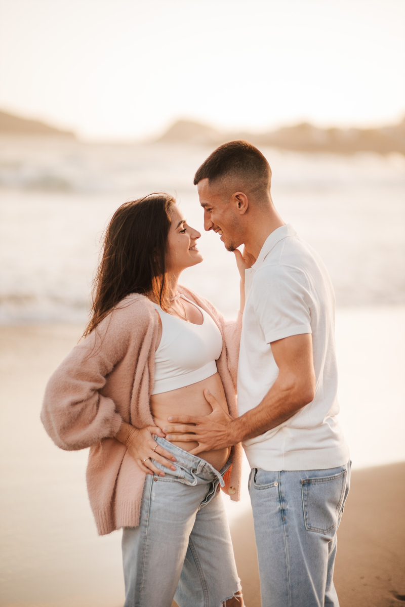 Uma bela sessão fotográfica de gravidez realizada na Praia das Milícias, com um magnífico pôr do sol como cenário. Os pais, Inês e o seu parceiro, encontram-se descontraídos, naturais e cheios de amor, aproveitando um final de dia maravilhoso.