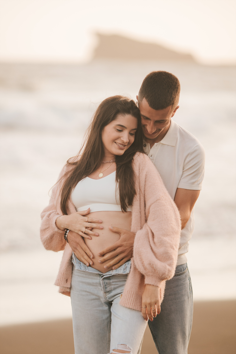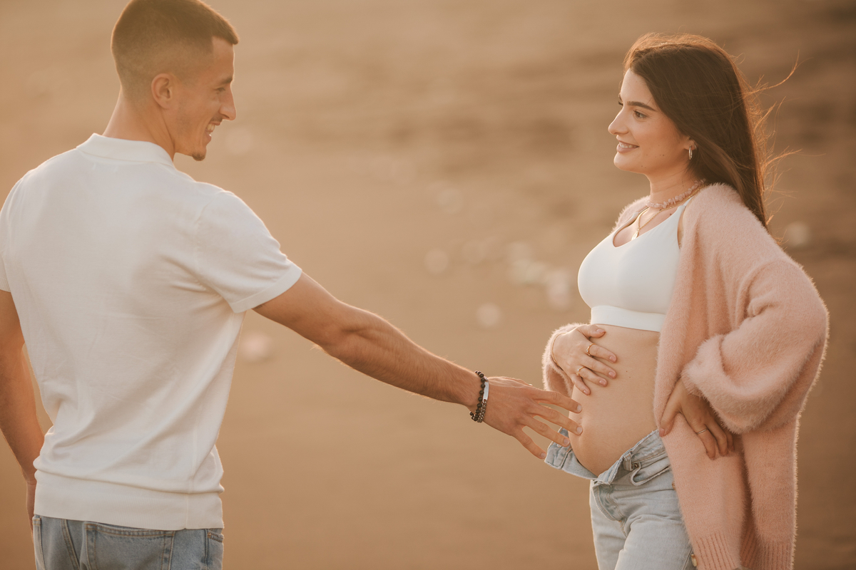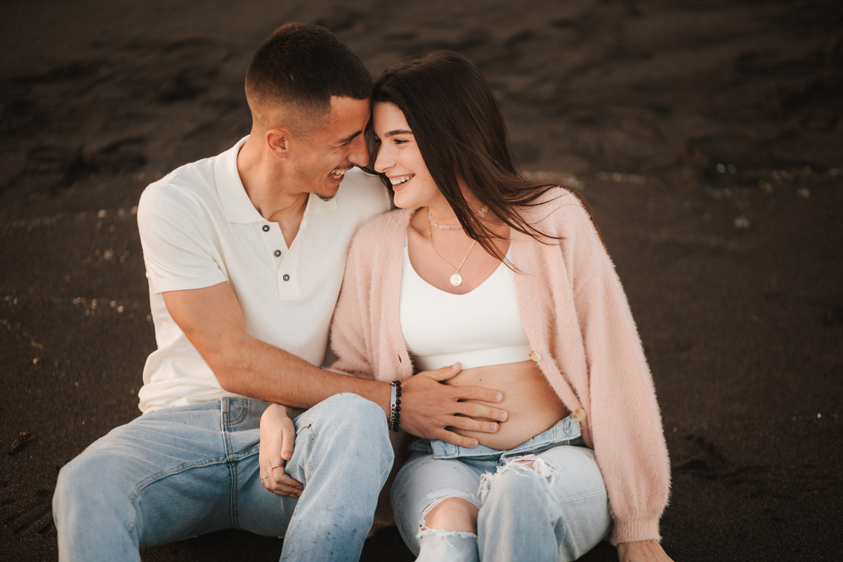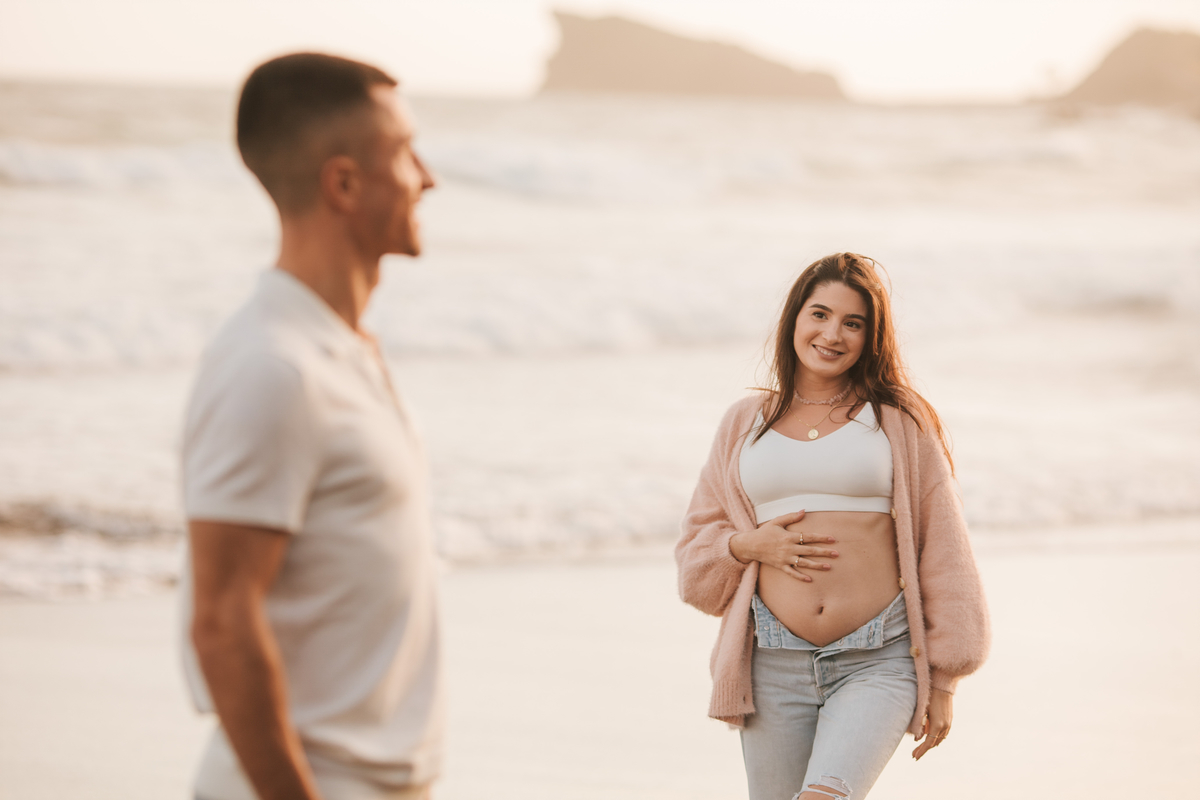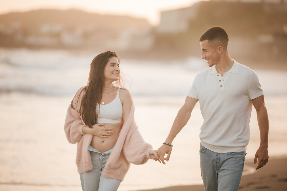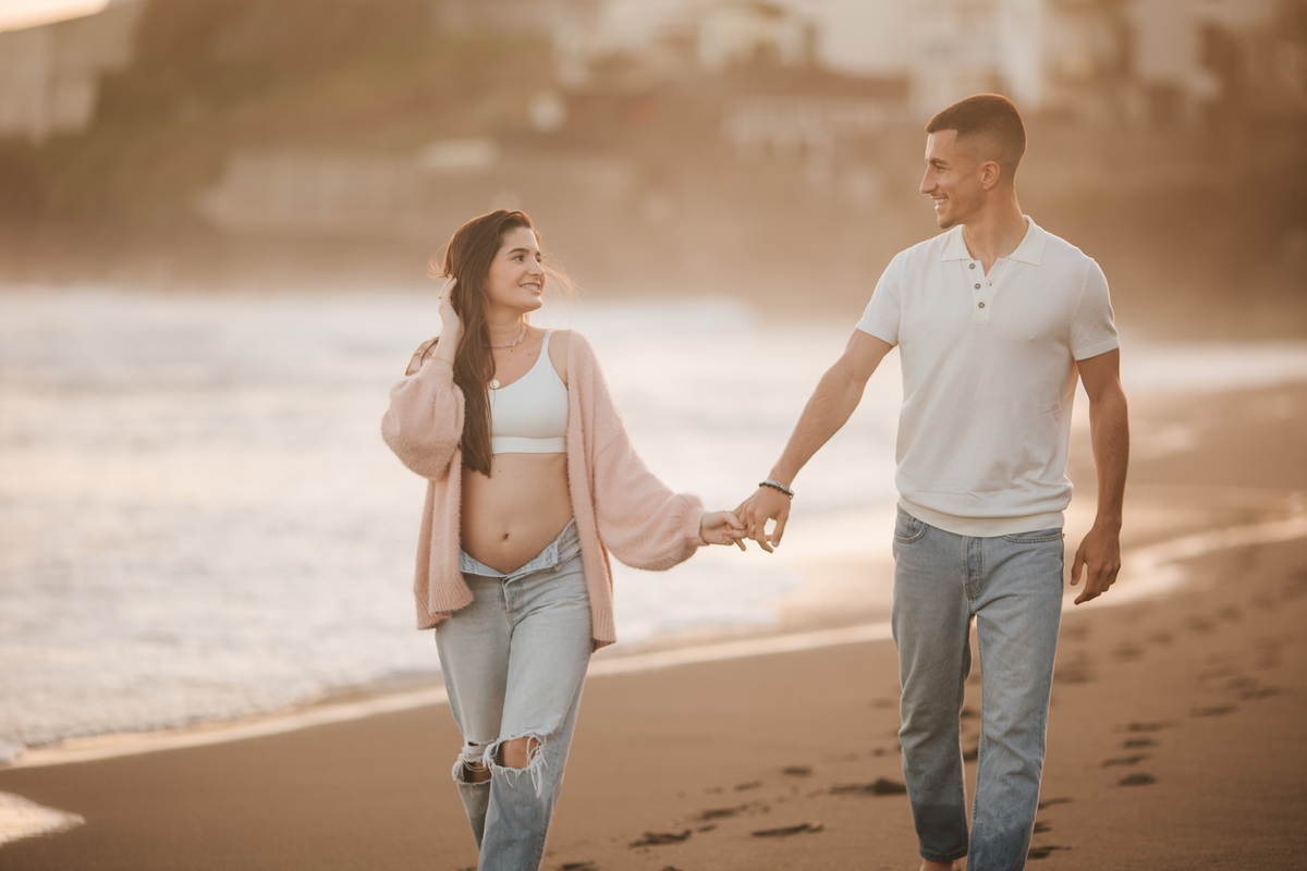 Uma bela sessão fotográfica de gravidez realizada na Praia das Milícias, com um magnífico pôr do sol como cenário. Os pais, Inês e o seu parceiro, encontram-se descontraídos, naturais e cheios de amor, aproveitando um final de dia maravilhoso.