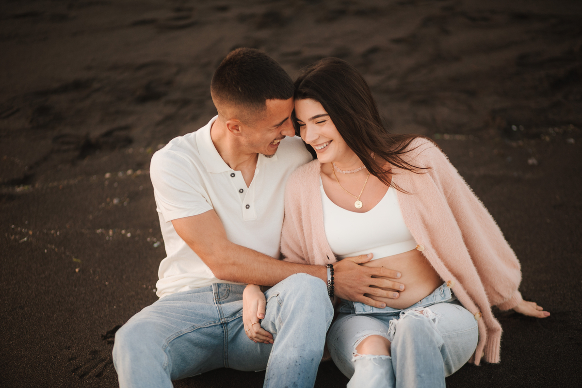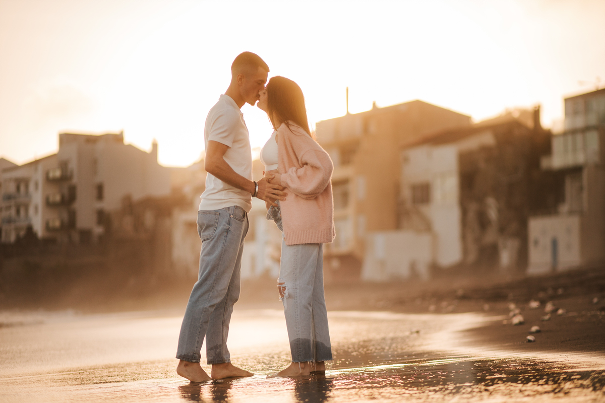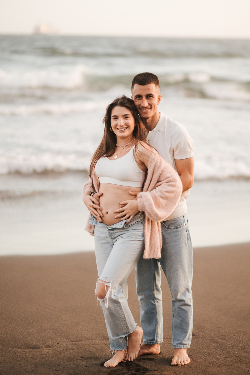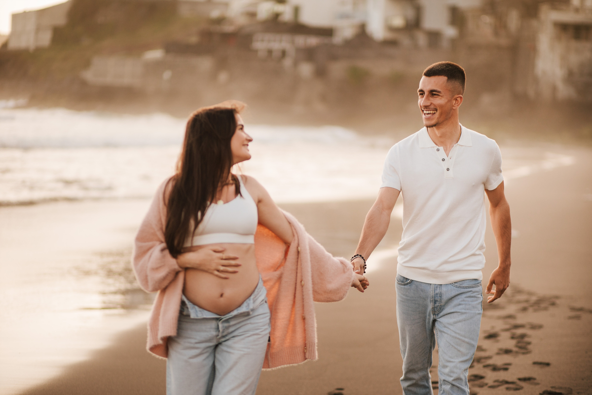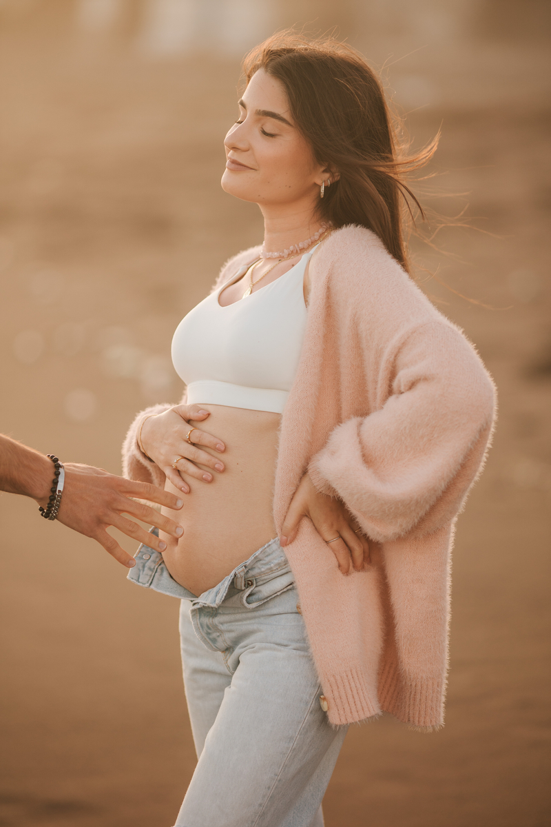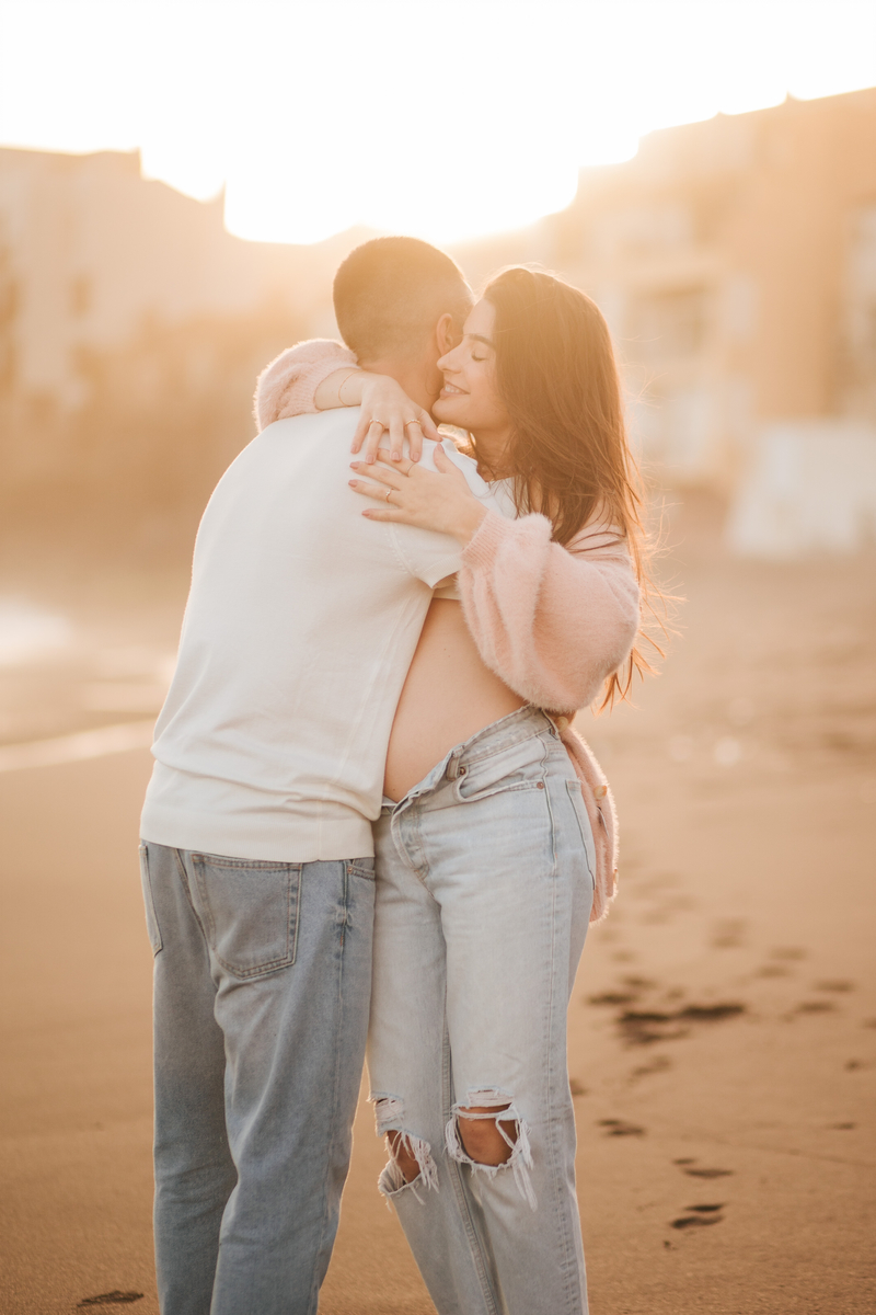 Uma bela sessão fotográfica de gravidez realizada na Praia das Milícias, com um magnífico pôr do sol como cenário. Os pais, Inês e o seu parceiro, encontram-se descontraídos, naturais e cheios de amor, aproveitando um final de dia maravilhoso.