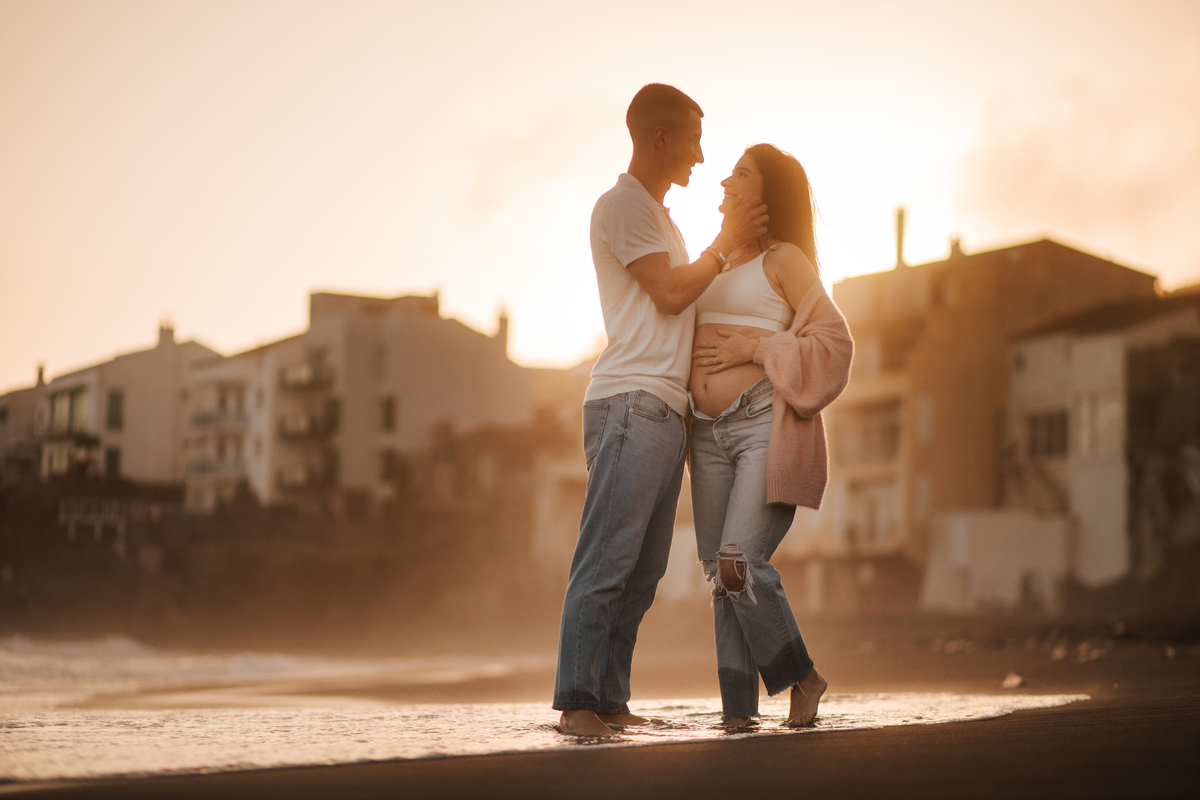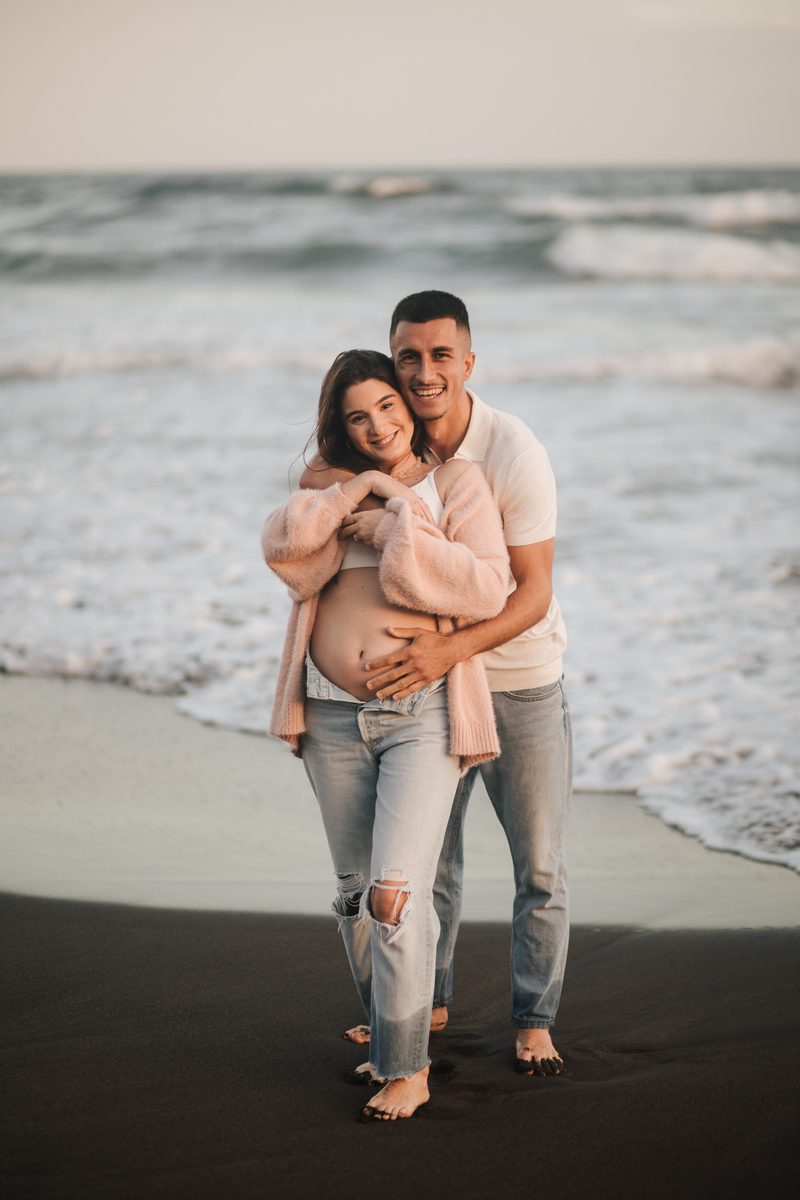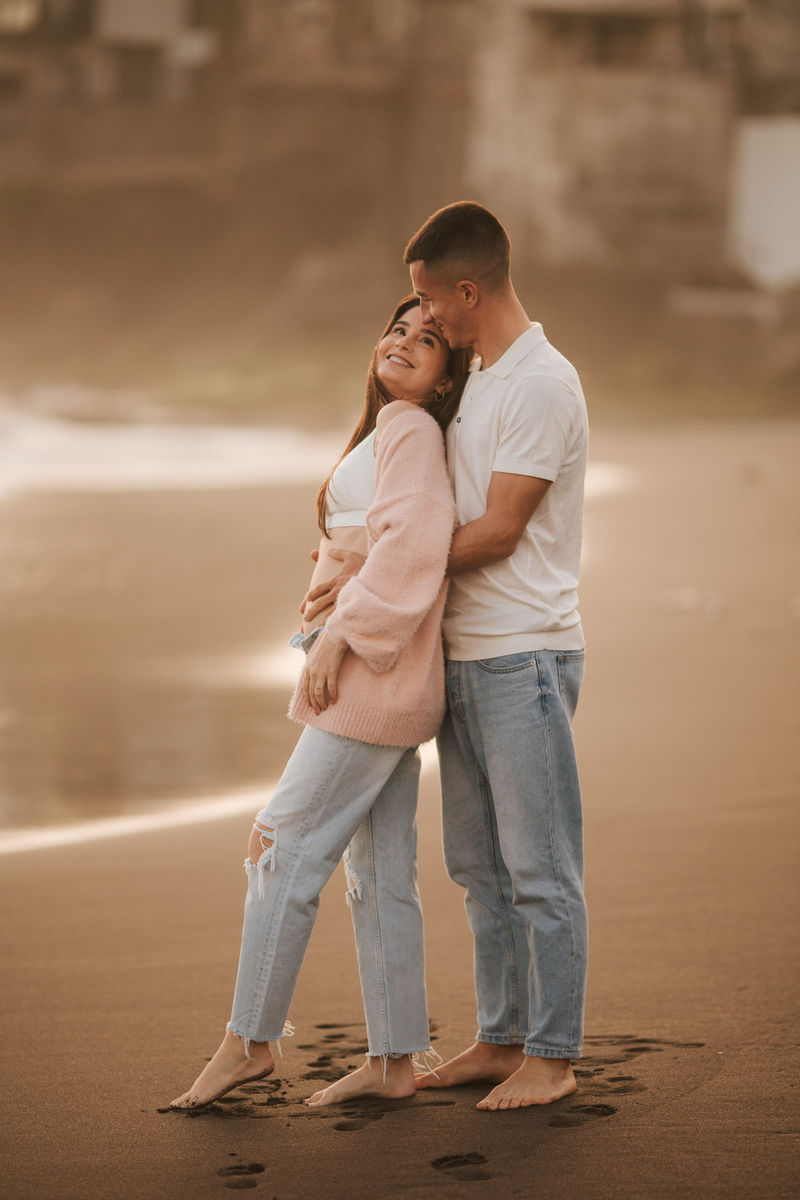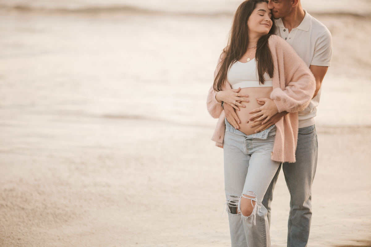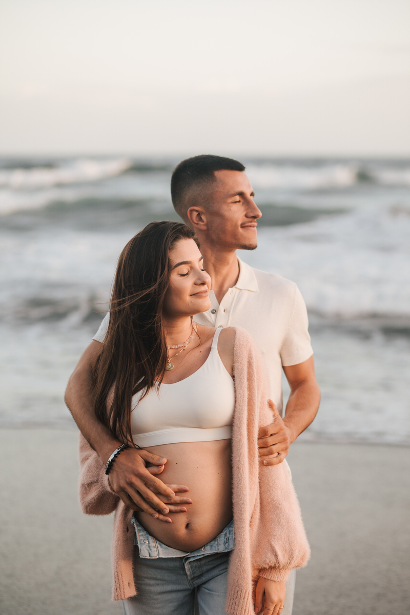 Uma bela sessão fotográfica de gravidez realizada na Praia das Milícias, com um magnífico pôr do sol como cenário. Os pais, Inês e o seu parceiro, encontram-se descontraídos, naturais e cheios de amor, aproveitando um final de dia maravilhoso.