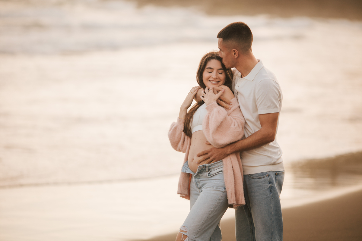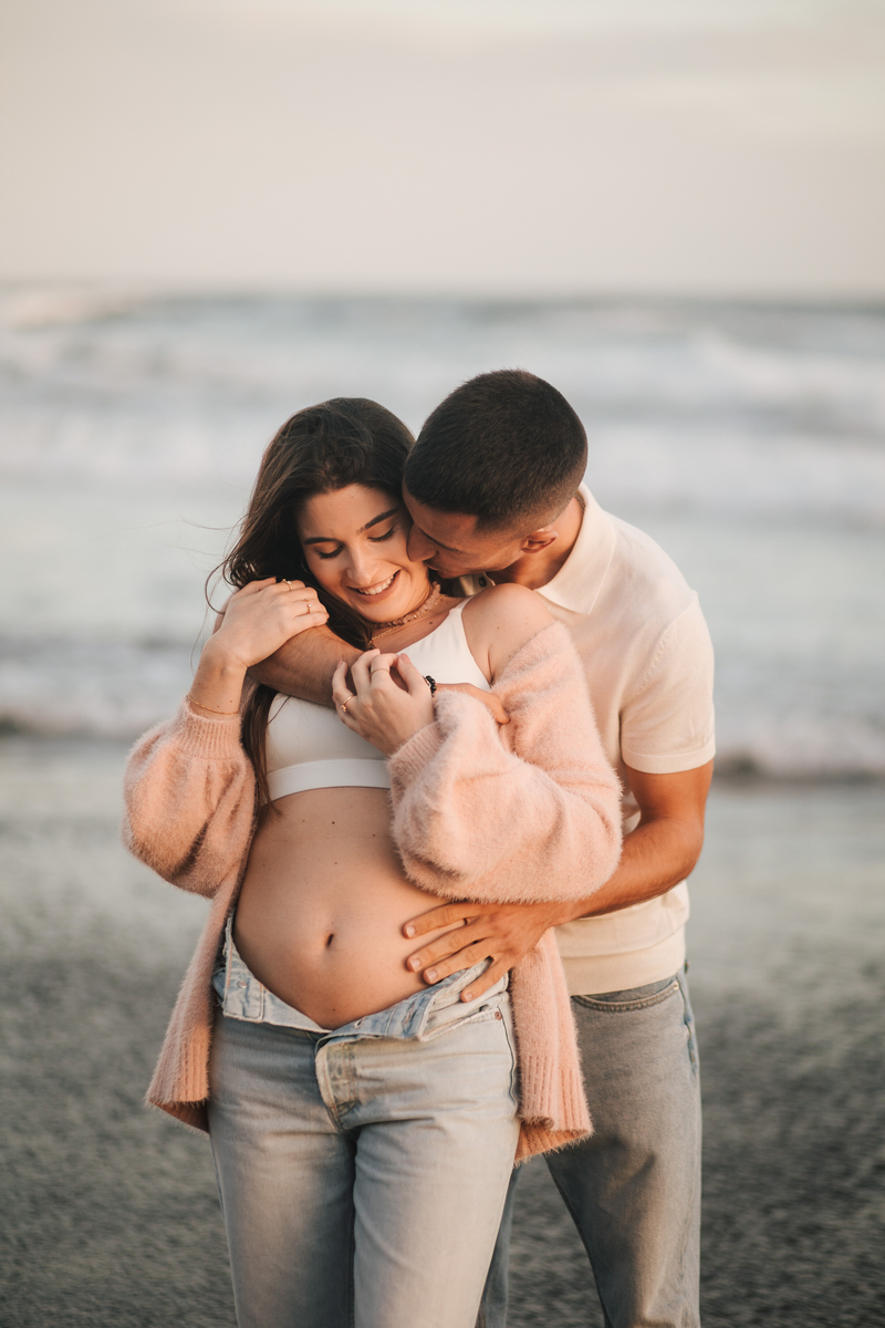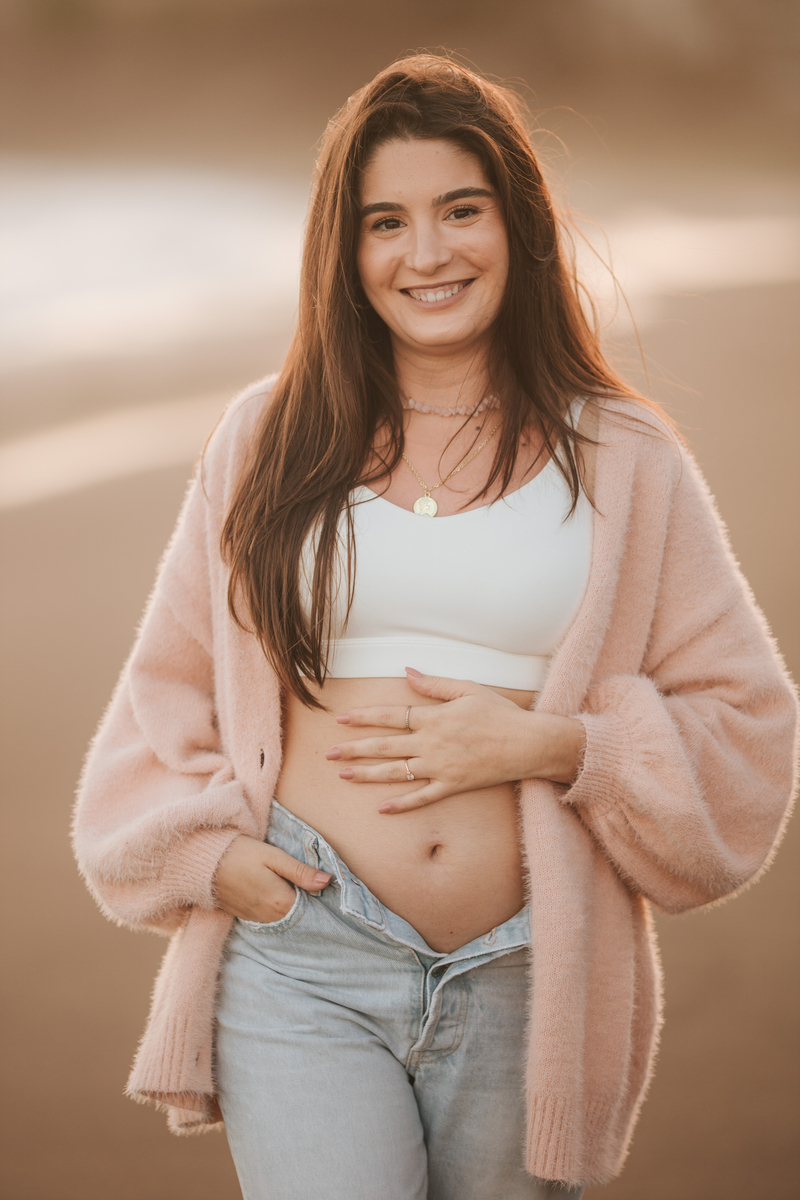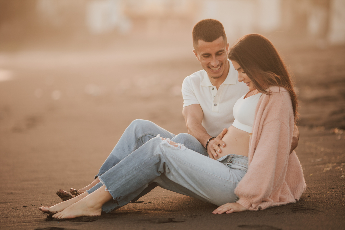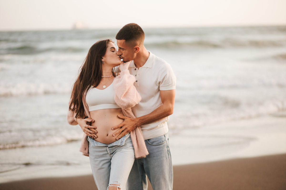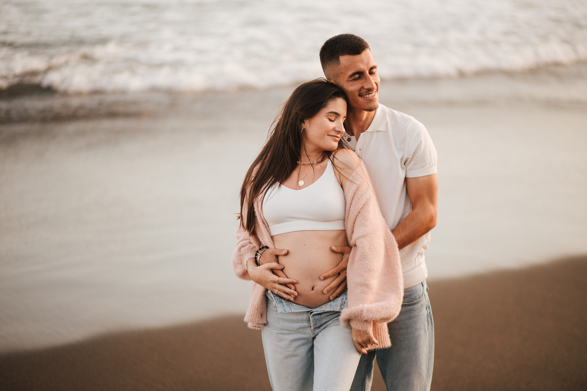 Uma bela sessão fotográfica de gravidez realizada na Praia das Milícias, com um magnífico pôr do sol como cenário. Os pais, Inês e o seu parceiro, encontram-se descontraídos, naturais e cheios de amor, aproveitando um final de dia maravilhoso.