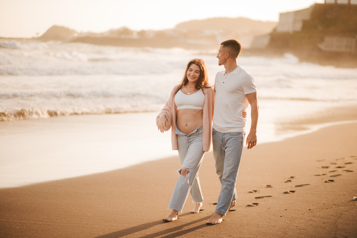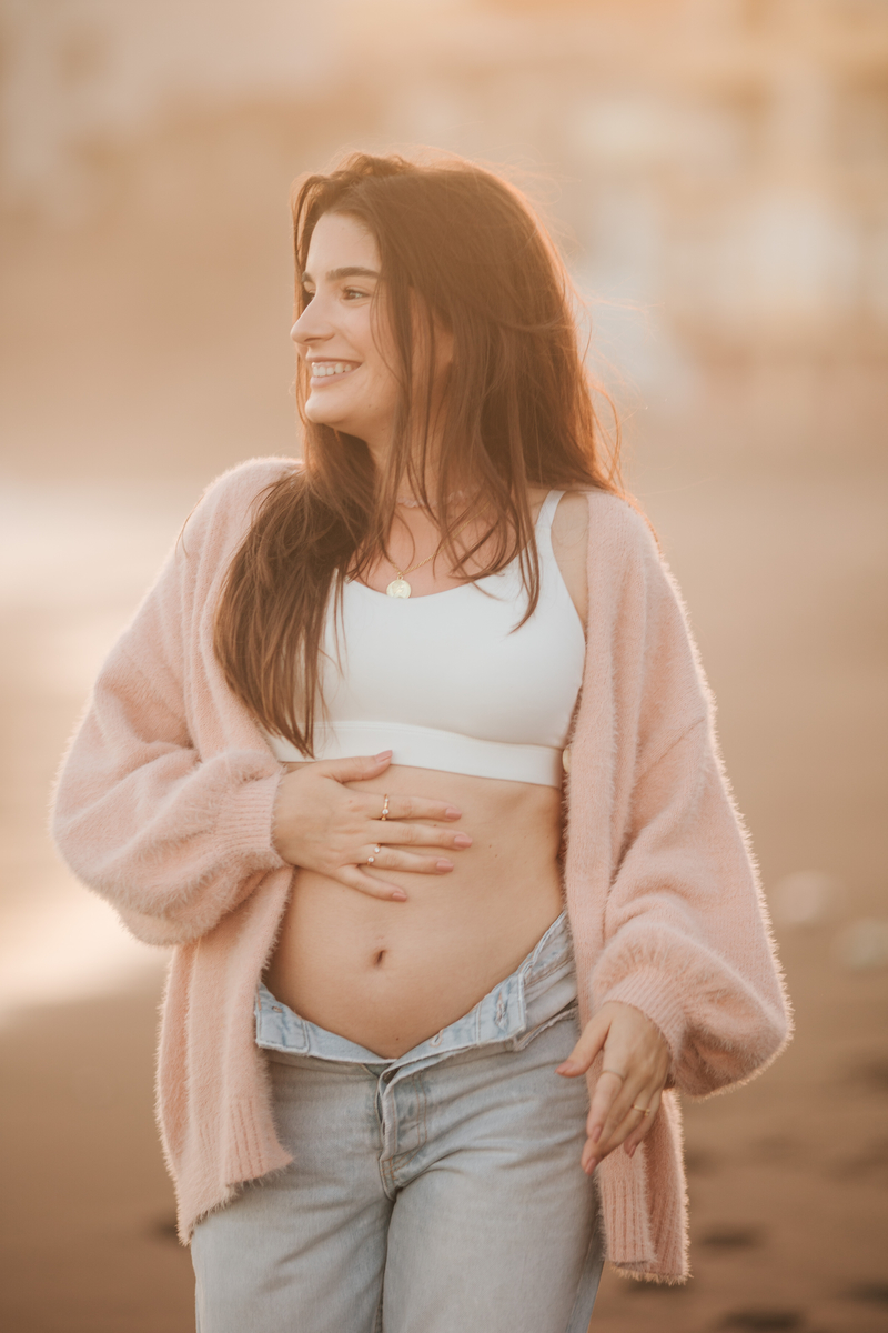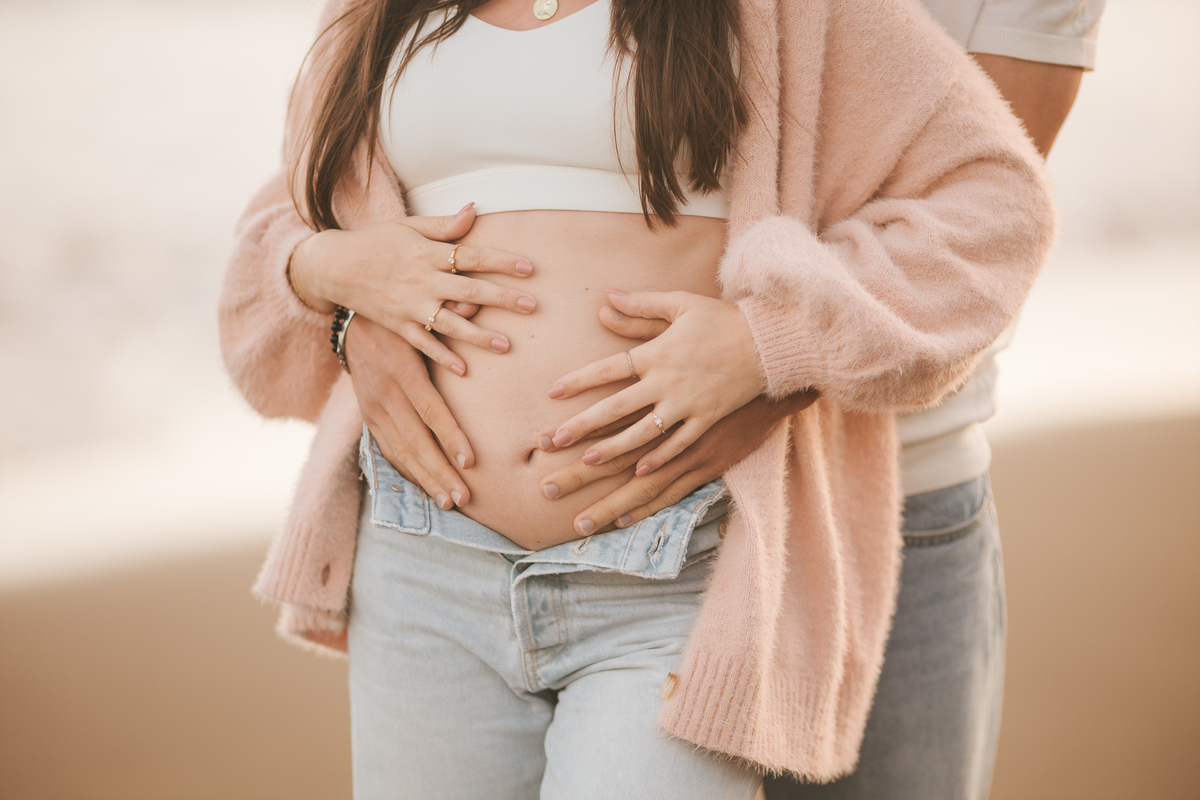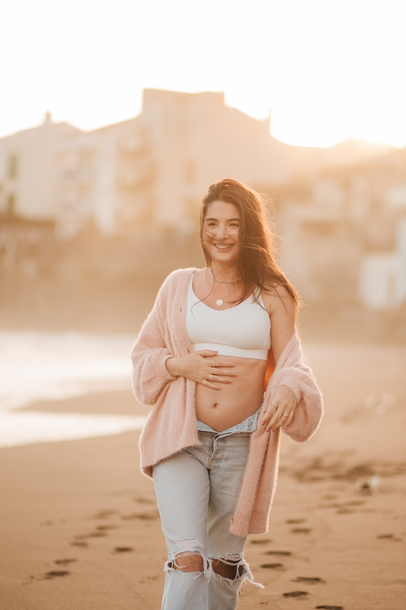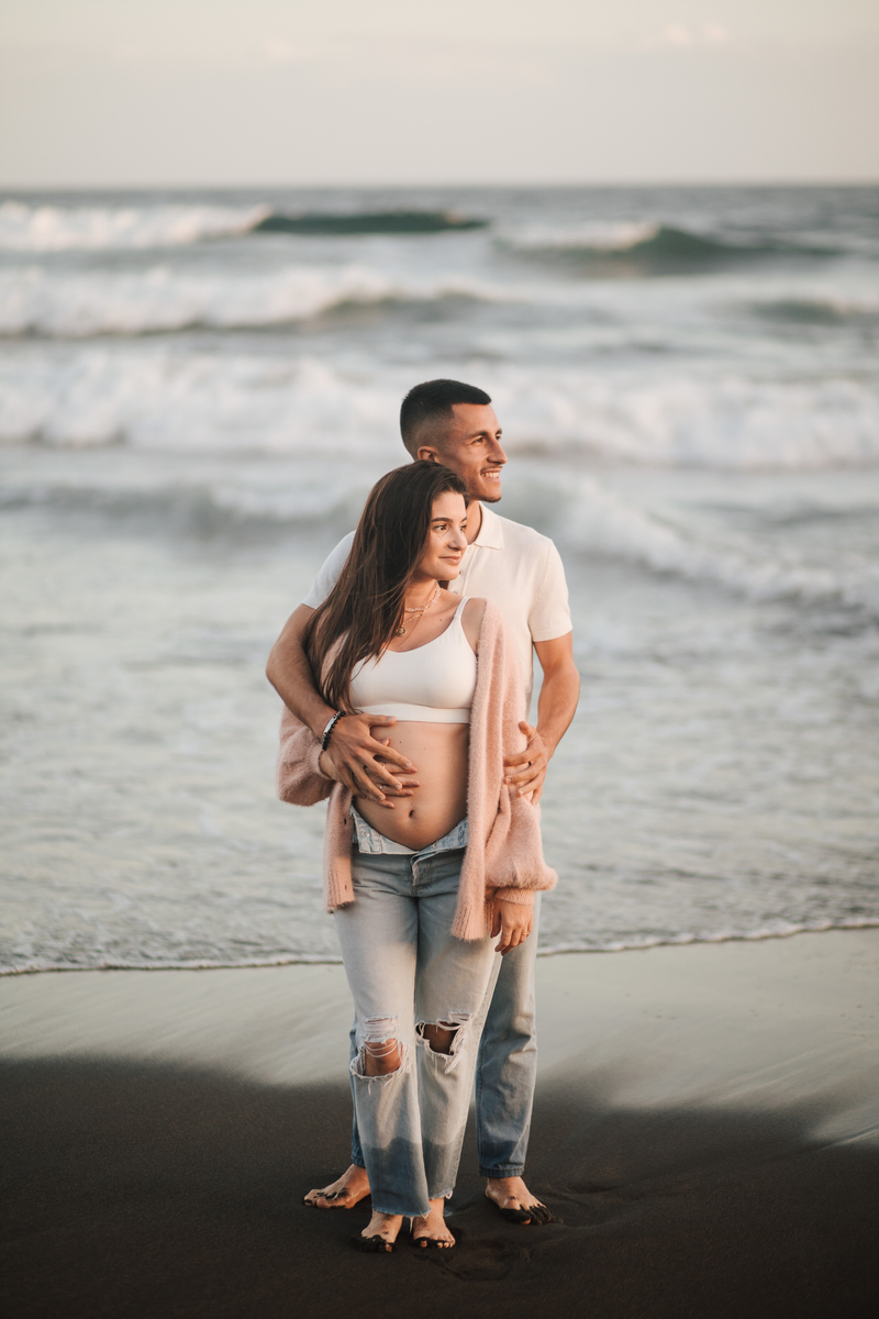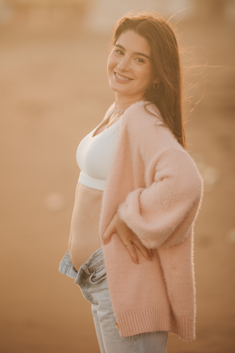 Uma bela sessão fotográfica de gravidez realizada na Praia das Milícias, com um magnífico pôr do sol como cenário. Os pais, Inês e o seu parceiro, encontram-se descontraídos, naturais e cheios de amor, aproveitando um final de dia maravilhoso.