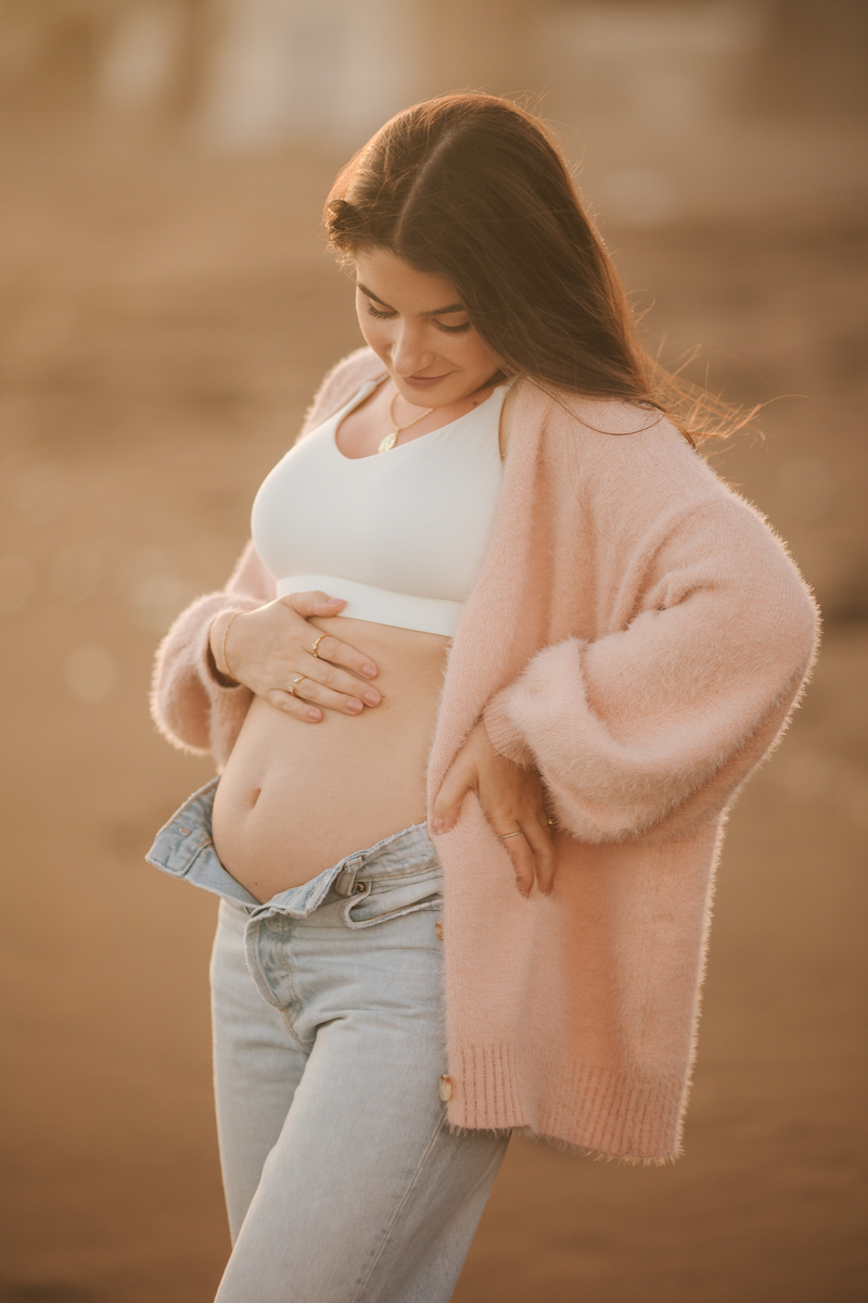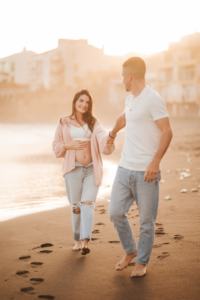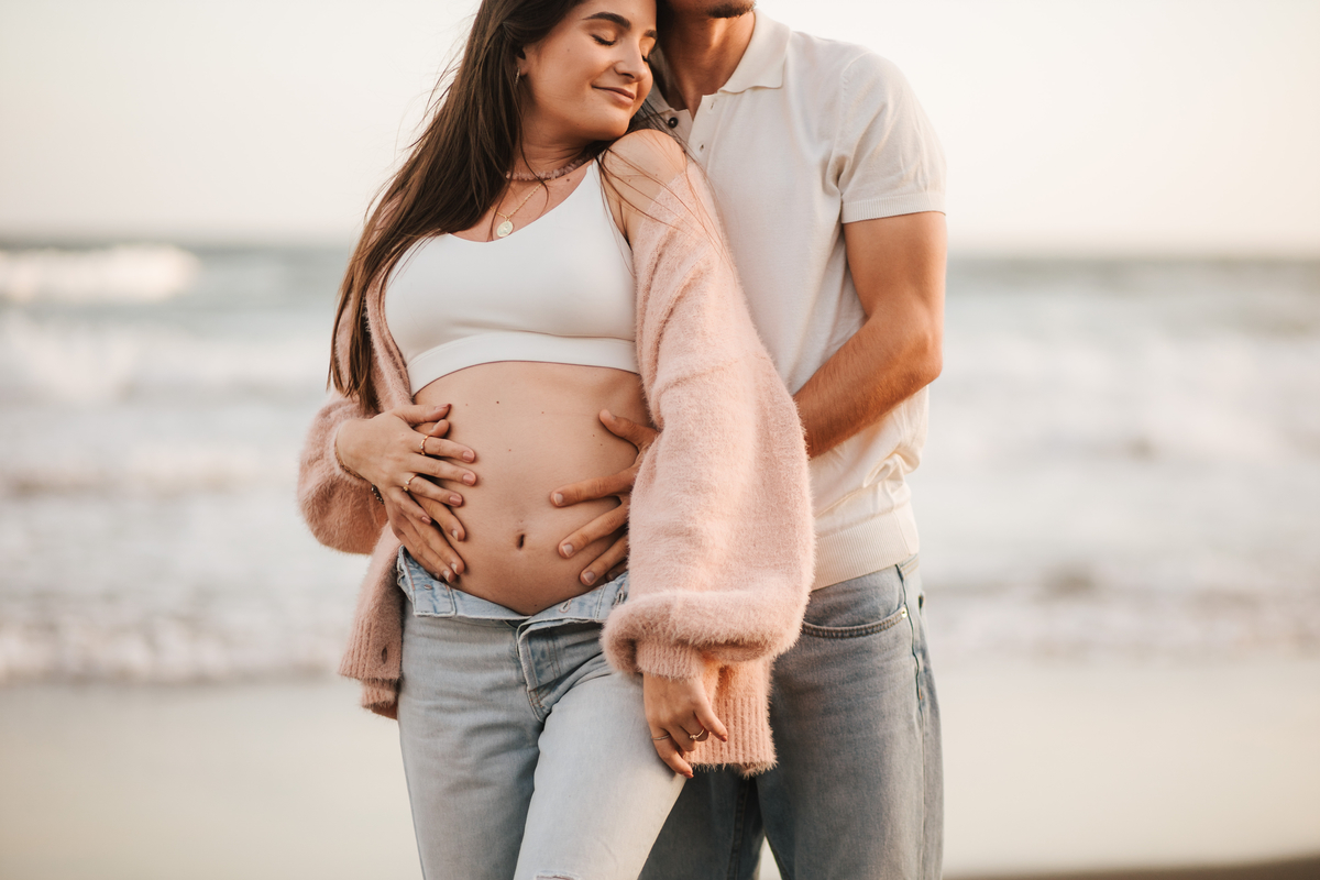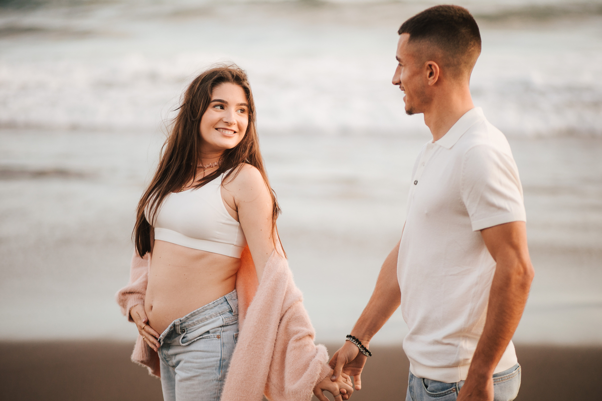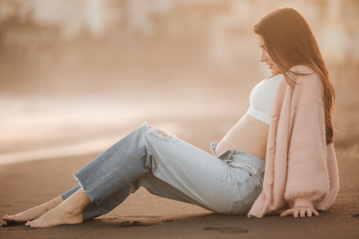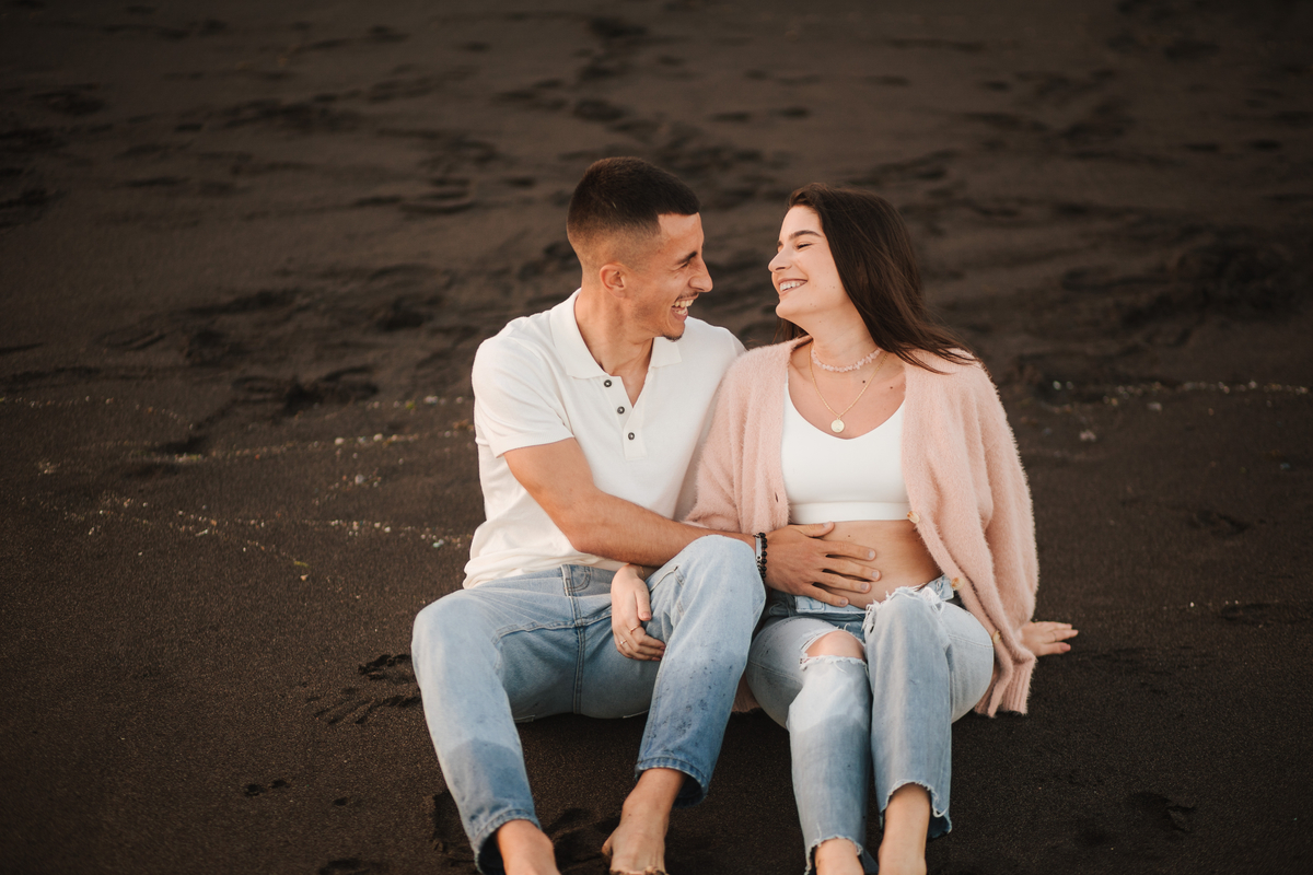 Uma bela sessão fotográfica de gravidez realizada na Praia das Milícias, com um magnífico pôr do sol como cenário. Os pais, Inês e o seu parceiro, encontram-se descontraídos, naturais e cheios de amor, aproveitando um final de dia maravilhoso.