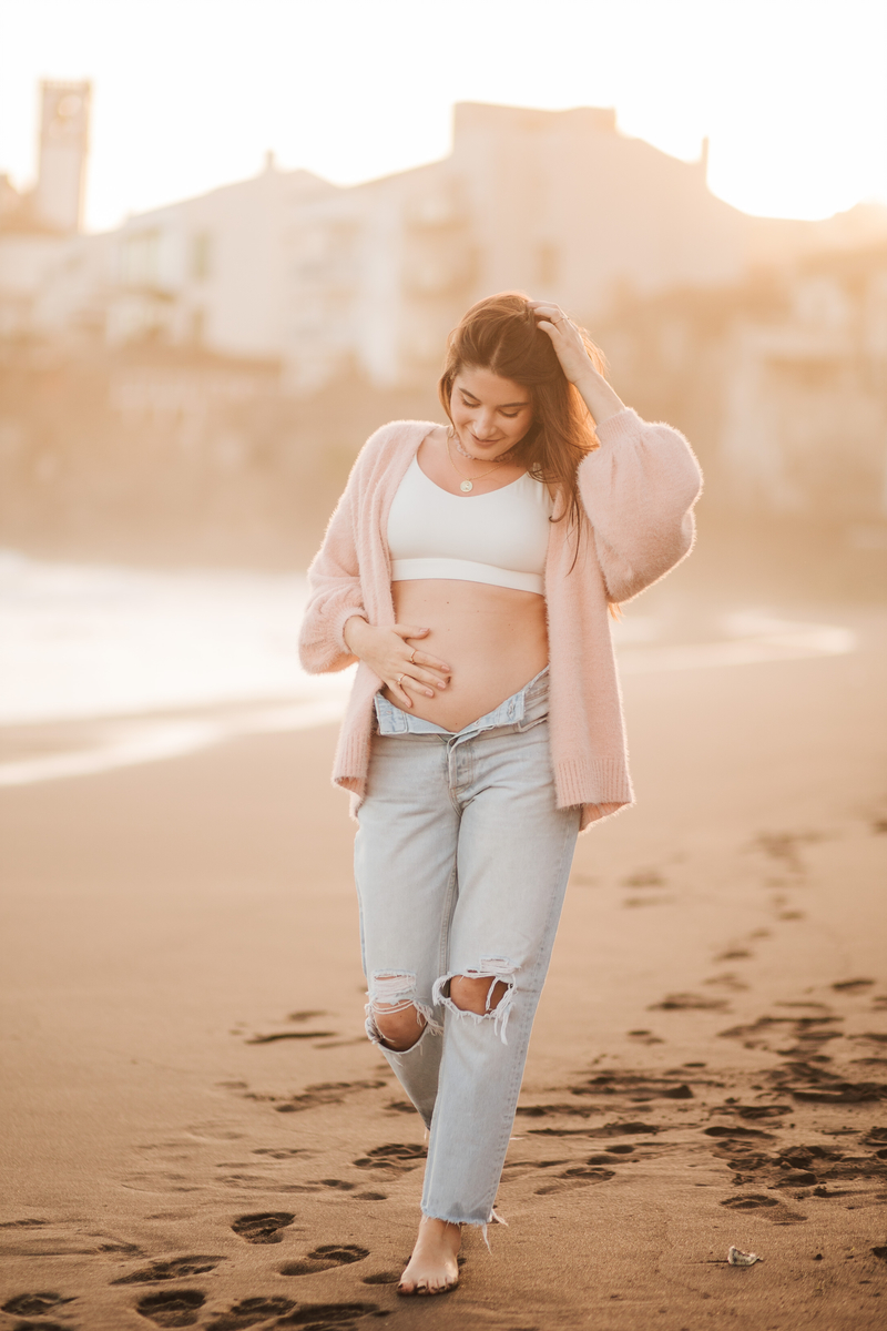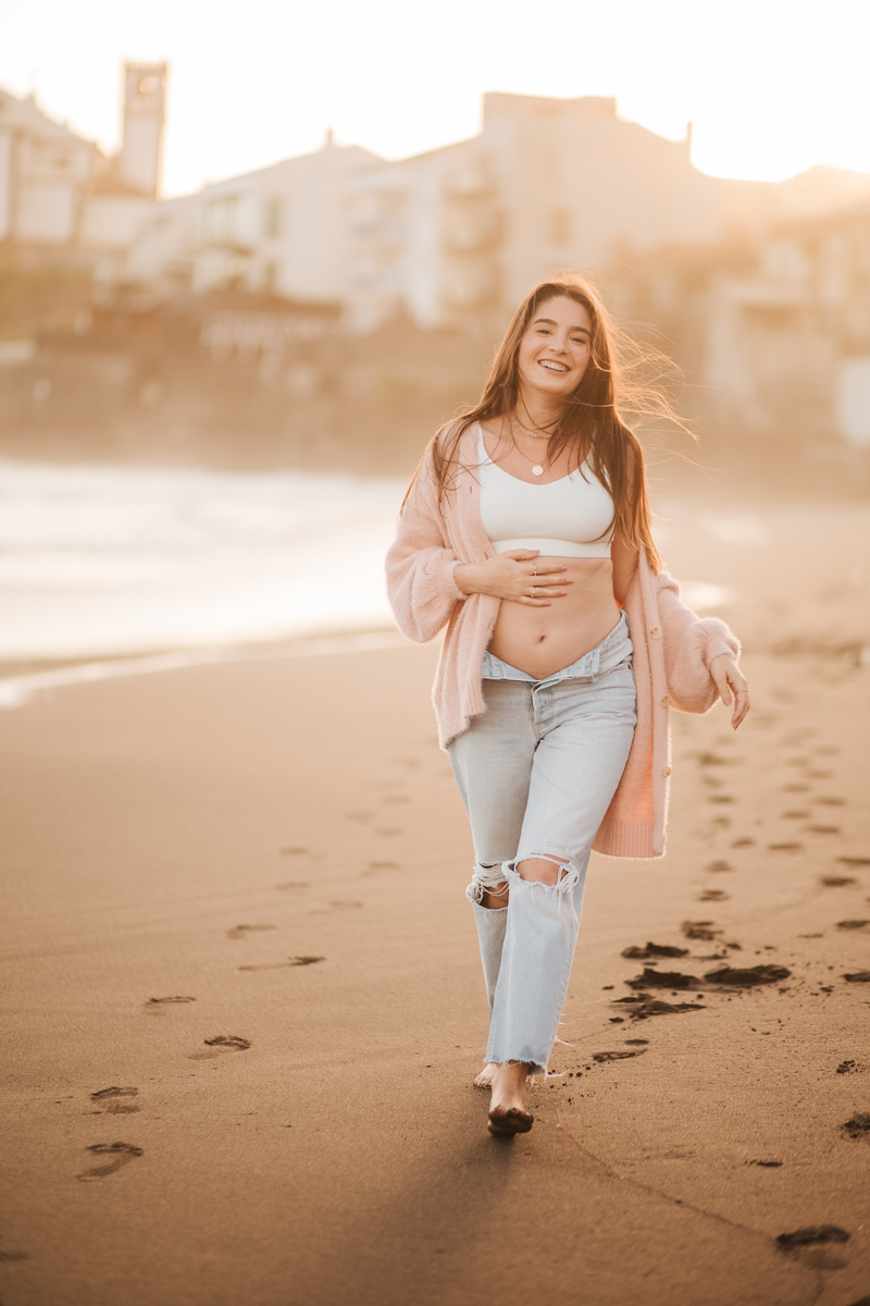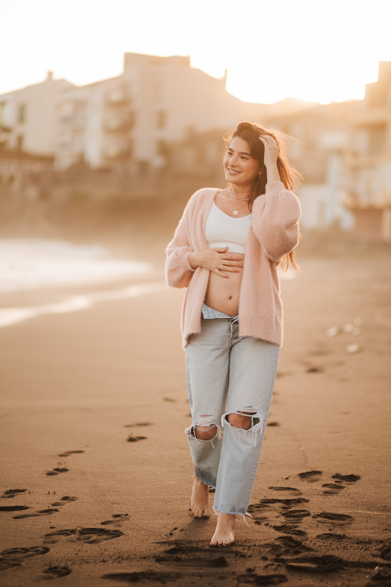 Inês, a futura mãe, estava deslumbrante. Ela vestia uma roupa muito descontraída e leve, em tons suaves que realçam a sua beleza natural. Os seus cabelos longos estão soltos e movem-se ao sabor do vento, enquanto ela caminha pela praia com graça. Um brilho especial ilumina o seu rosto, revelando a felicidade e serenidade que sente ao carregar uma nova vida no seu ventre.