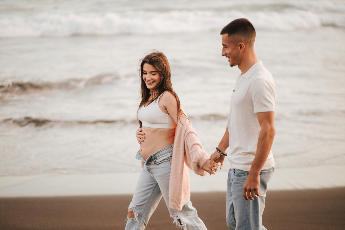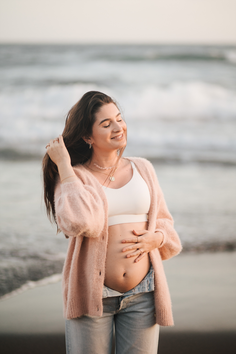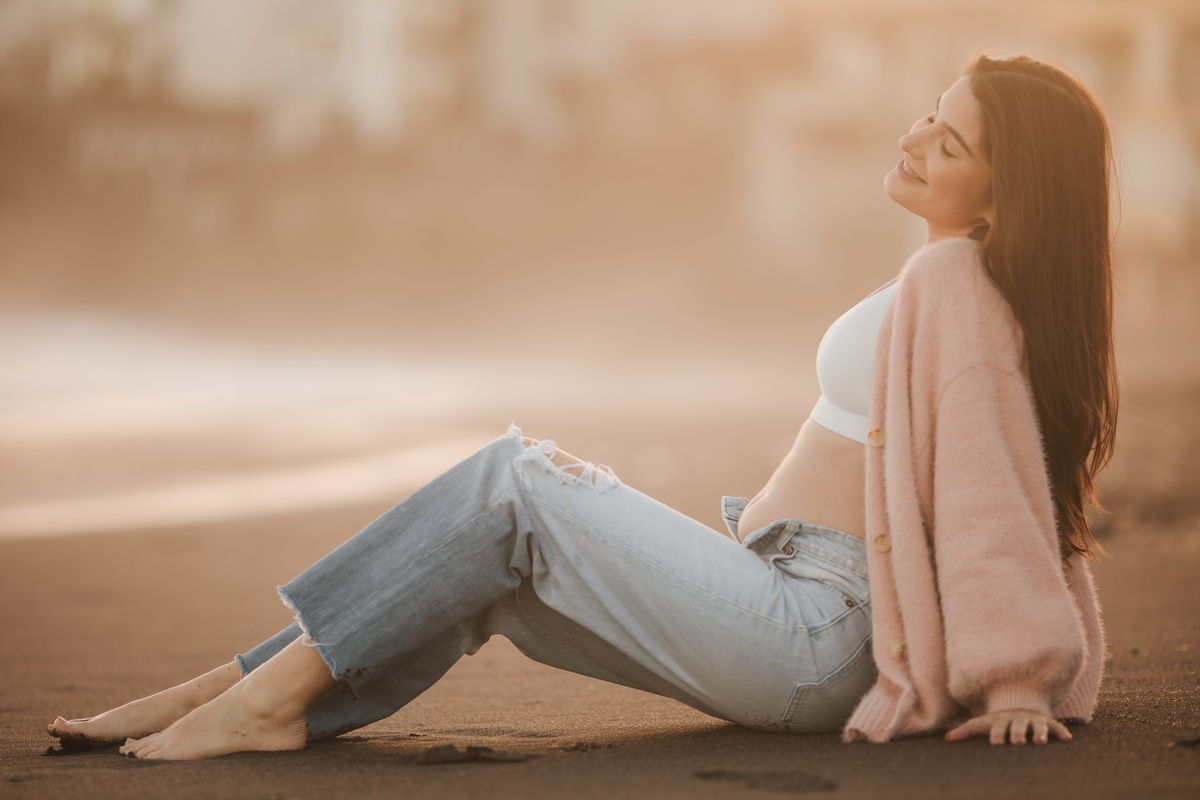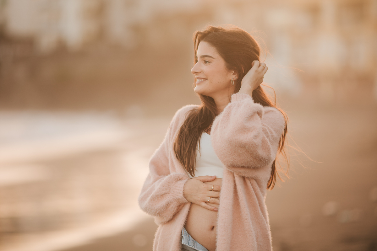 Inês, a futura mãe, estava deslumbrante. Ela vestia uma roupa muito descontraída e leve, em tons suaves que realçam a sua beleza natural. Os seus cabelos longos estão soltos e movem-se ao sabor do vento, enquanto ela caminha pela praia com graça. Um brilho especial ilumina o seu rosto, revelando a felicidade e serenidade que sente ao carregar uma nova vida no seu ventre.